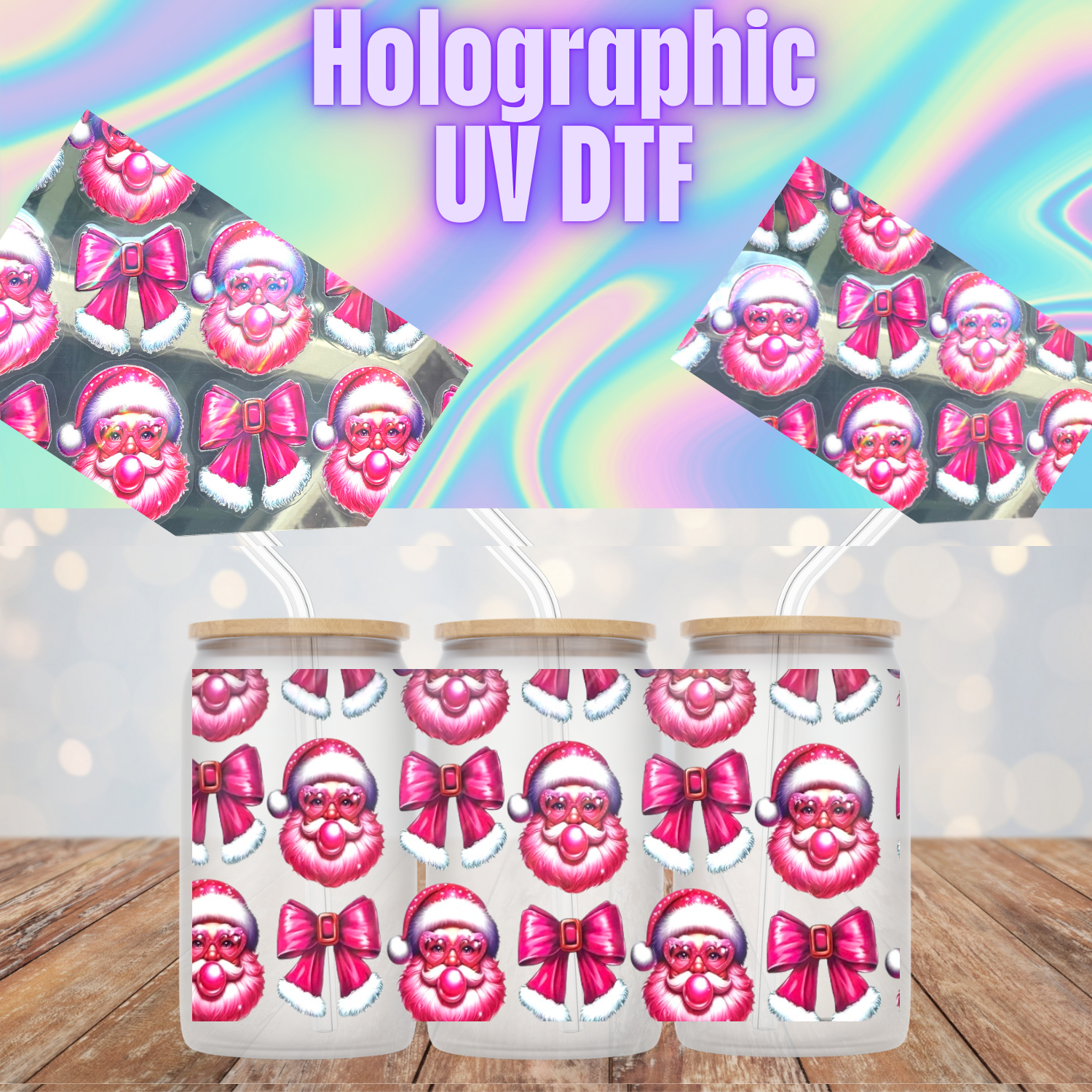 HOLOGRAPHIC PINK BUBBLE GUM SANTA UV DTF CUP WRAP
